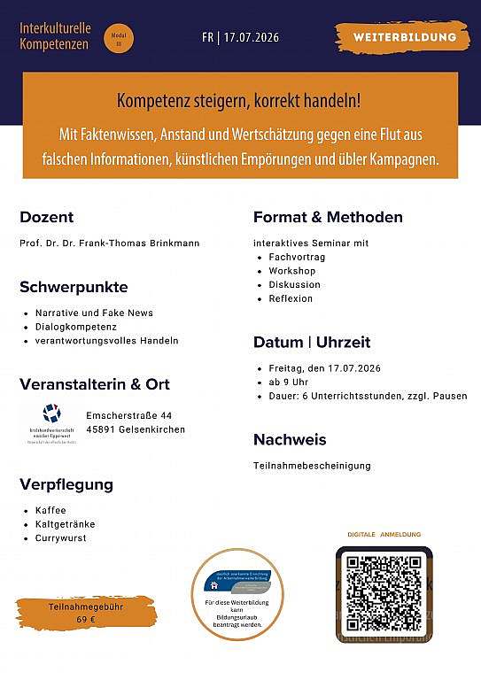 17.07.2026 ab 9 Uhr: Modul III – Kompetenz steigern, korrekt handeln! Mit Faktenwissen, Anstand und Wertschätzung gegen eine Flut aus falschen Informationen, künstlichen Empörungen und übler Kampagnen.