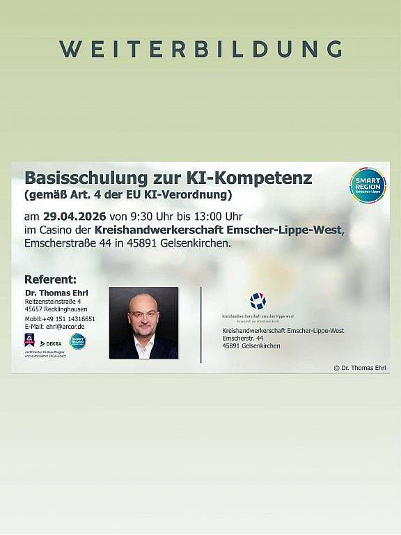 Basisschulung zur KI-Kompetenz: Am 29.04.2026 bietet die KH ELW eine Schulung zur Erfüllung der Arbeitgeberpflicht an. Experte und Smart Region-Kooperationspartner Dr. Thomas Ehrl leitet die Schulung.